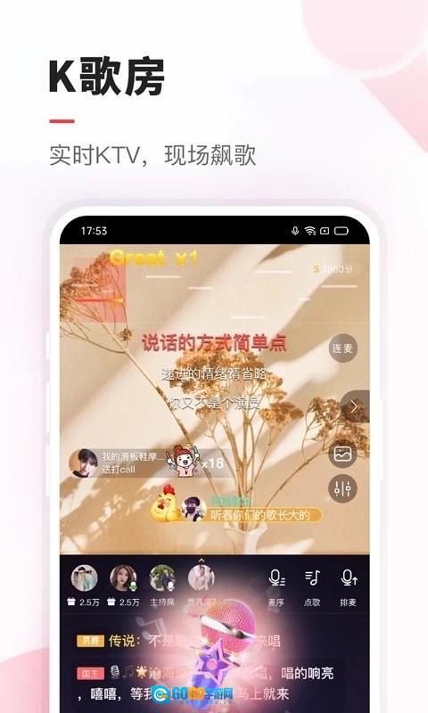 4、【房间】:K歌房高度还原线下KTV的沉浸式体验,你可以和好友们一同放声高歌、互动对唱,演唱时还能即时查看自己的分数。要是不想唱歌,约上三五好友在聊天室里连麦畅快聊天,也是十分惬意的消遣。