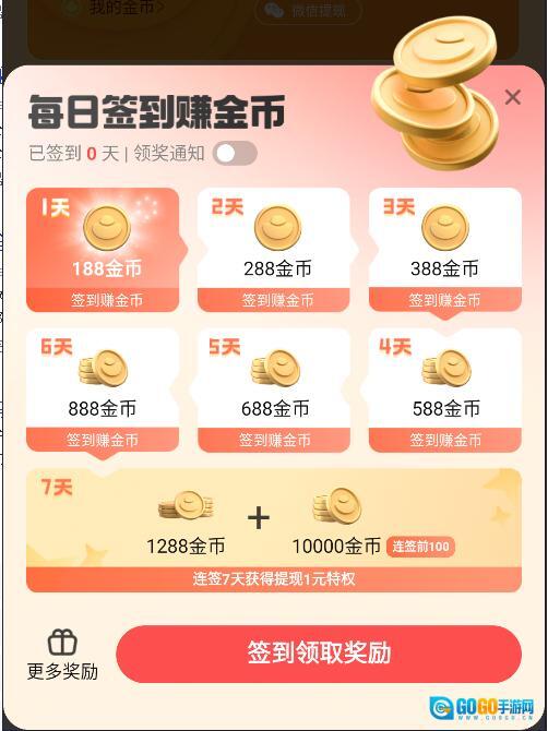 4、点击【去赚更多钱】按钮,弹出一个每日签到赚金币玩法,这里每天签到给不同的金币,第一天188金币,第二天288金币,第三天388金币,第四天588金币,第五天688金币,第六天888金币,第七天就能拿到1288金币+10000金币哦,并且还能获得连续7天提现1元特权哦。