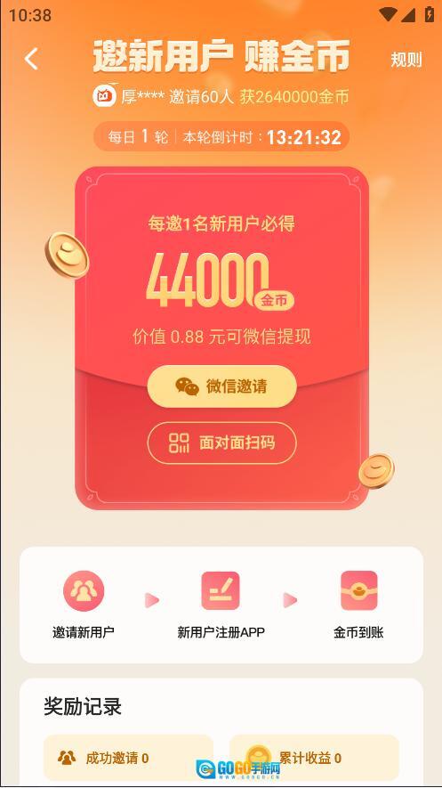 6、点击邀请新用户领取44000金币,价值0.88元红包福利,可以提现至微信哦。(还是抠门,连抖音邀请新用户福利都不如)