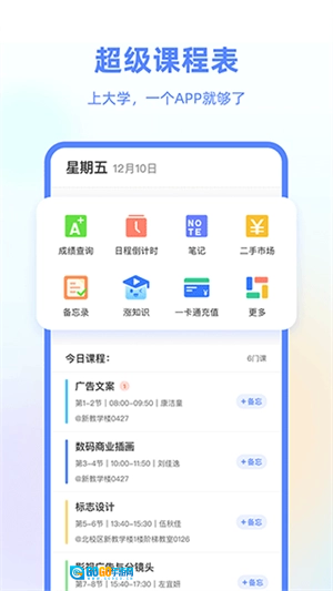 产品经理和产品设计拍着胸脯自信满满地让我转达你们,大学不同于高中,总固定在一间教室上课,大学里的上课时间和地点都不固定,教学楼和教室又多,出了宿舍门,发现只记得要上课,上什么课?在哪上课?完全记不起来。一键导入课表能让你在手机里随时随地查看课程信息,另外通过【桌面小组件】查看课表,自由切换的【日课表】和【周课表】你们大可先用用看……