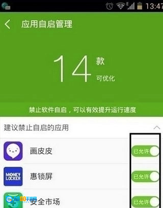 然后就会显示所有默认在后台自启动的软件。能看到这里有14款软件开机自启动,手机出现卡顿也就不足为奇了
