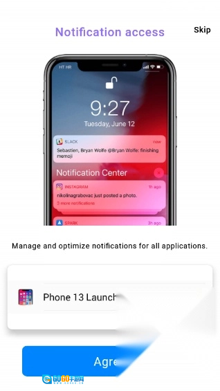 2、首次启动时会弹出通知权限请求,若希望模拟通知效果更逼真,点击“Agree”完成授权即可;若暂不想授权,选择“Skip”也能正常使用功能。