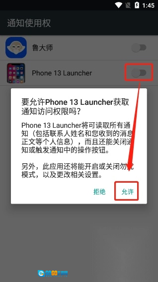 3、开启权限后,点击“Agree”按钮,系统会跳转至设置界面,以便开启通知使用权。