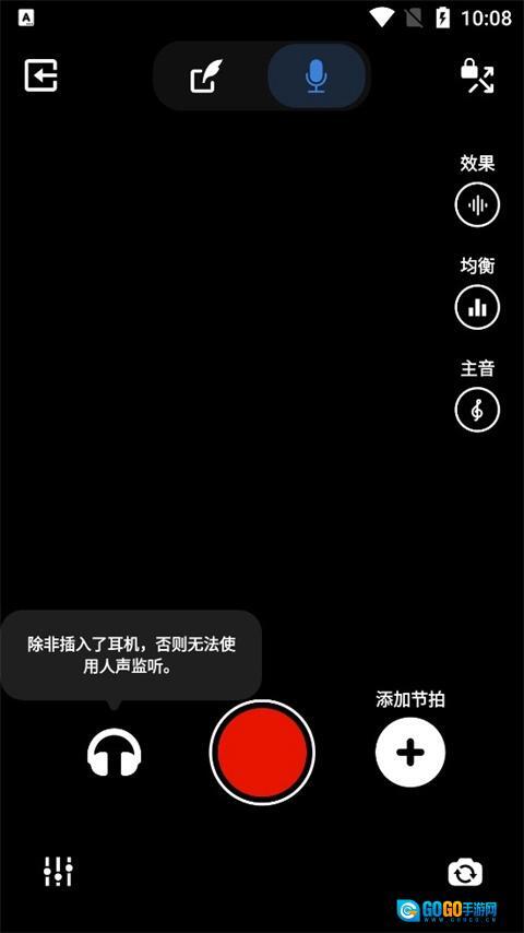 ②您可关闭语音监控功能,以此避免延迟分散注意力。人声监控按钮在录音室界面的左上角。关闭该功能后,录制过程中您无法通过耳机听到自己的声音,但Voloco仍会正常录制您的人声。