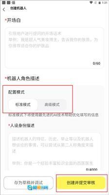 先在输入区域填写开场话术,接着挑选合适的配置模式,再详细描述角色设定,完成这些步骤后,点击界面右下角的“创建并提交审核”按钮即可。