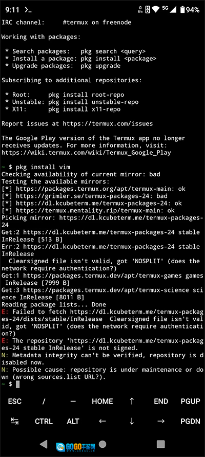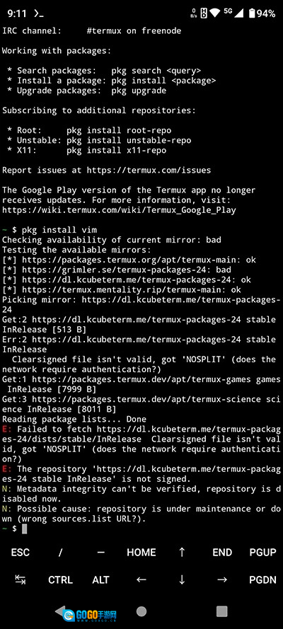 在使用 Termux 安装软件包之前,通常需要先更换镜像源;如果不更换,可能会出现安装速度缓慢甚至安装失败的情况。下面这张图片展示的是未更换镜像源时尝试安装 vim 失败的截图。