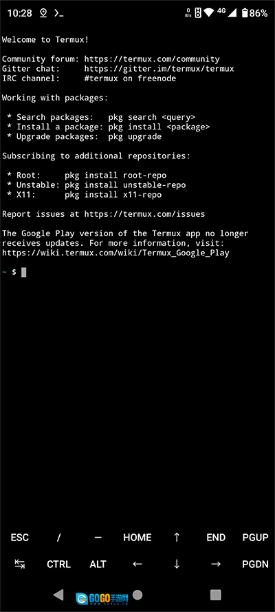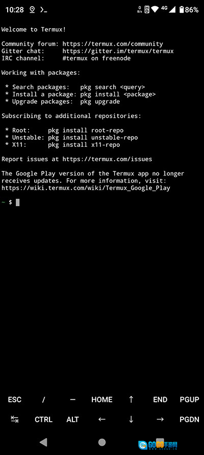 等“Installing bootstrap packages (安装引导程序包)”的过程结束,就能看到Termux的欢迎界面了,就像下面这张图显示的这样。