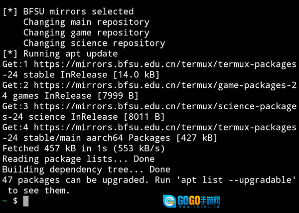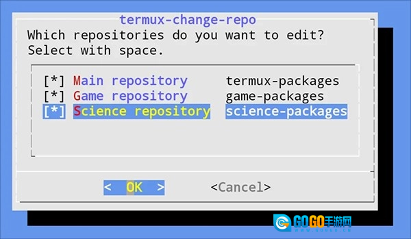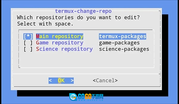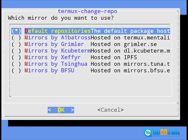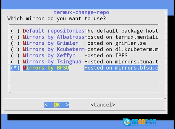 下面以更换清华大学开源软件镜像源为例,在Termux里运行termux-change-repo命令,即可进入对应的图形操作界面(界面样式可参考下方示意图)。