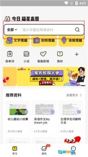 2、进入软件后,主页面上有一个搜索框,借助它可以搜题来完成作业。