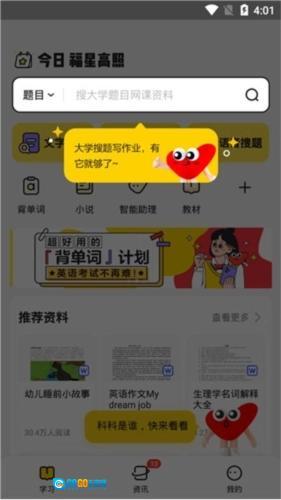 3、查题、文本文档、网络课程、教材内容等高校各类学习材料全面汇聚,一键搜索即可获取所需。