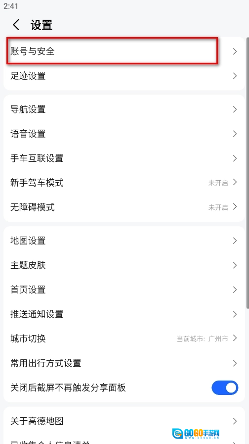 在设置界面点击账号与安全