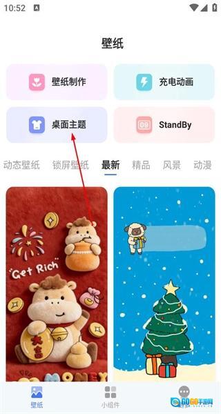 1、打开软件后,进入首页,查看壁纸制作等功能选项及最新壁纸展示,点击桌面主题选项,进入主题页面。