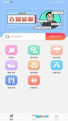 聊天话术王是专为低情商人士打造的专业恋爱聊天话术软件,这里提供海量恋爱话术,单身的你值得拥有。你可以随时查看恋爱话术,也能随时寻找真实的聊天对象,再也不用因不会聊天而纠结。掌握更多撩妹攻略后,就能轻松脱单,不必再为单身发愁啦!快来试试吧!!