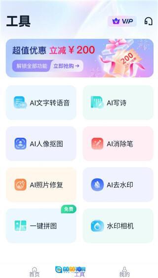 2、工具栏里包含了丰富的细分功能,像AI人像抠图、AI消除笔、AI照片修复、AI去水印等都在其中。