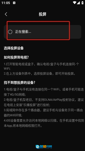 选择投屏设备时,请确保手机和电视连接在同一个WiFi网络下。