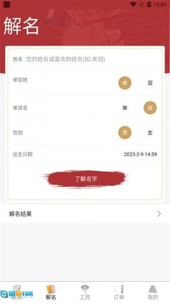 2、点击起名,输入相关的信息,一键查询名字;