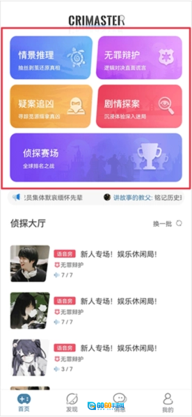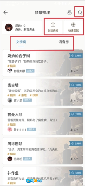 2、比如情景推理模式中又分为文字房和语音房两种模式,玩家可根据自身情况选择玩法,同时玩家可以选择创建新房间、根据房间id搜索房间、快速加入房间来进入游戏