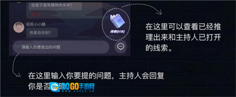 4、玩家了解游戏剧情后,可以在下方输入你要提问题,主持人会回复你是否正确,点击右边的线索可以查看已经推理出来的和主持人已打开的线索