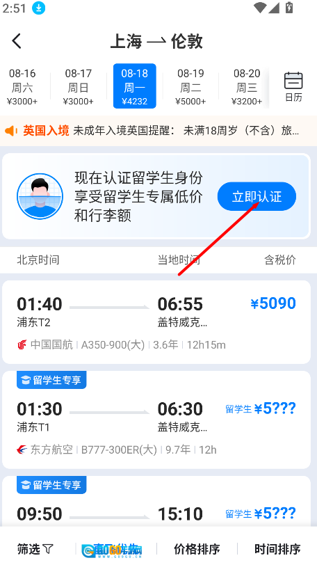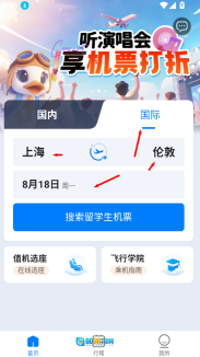 1、进入早鸟学生机票首页后,在搜索栏填写出发地“上海”与目的地“伦敦”,选定出行日期并点击搜索,就能快速查看相关航班及学生票信息。