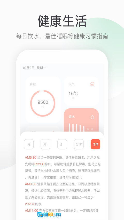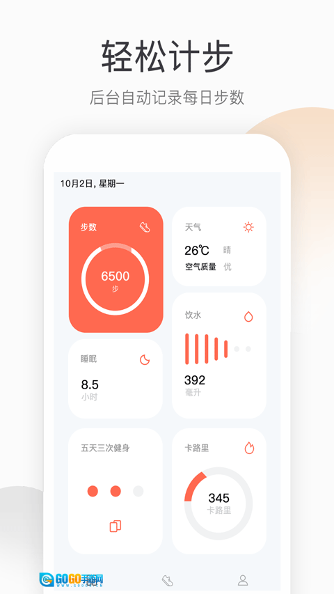 【功能简洁,记录精准】轻便的计步功能,一键开启,即可随时查看自身的行走状态,是健康生活的得力助手。
