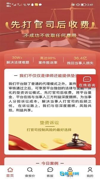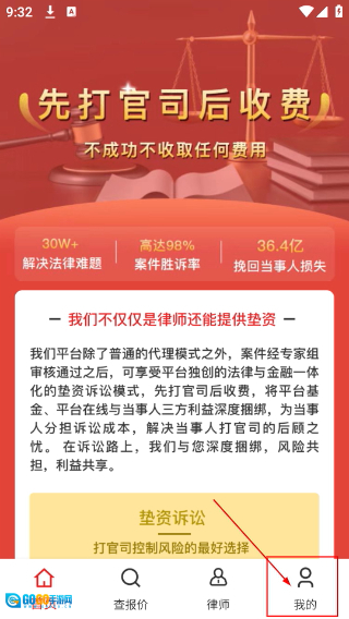 2、进入界面后,可了解“先打官司后收费”——即案件不成功则不收取任何费用的服务模式,随后点击底部的“我的”选项,即可使用“垫资诉讼”等相关法律服务。