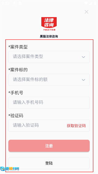 3、在【黑猫法律咨询】的注册页面,按顺序填写【案件类型】【案件标的】【手机号】及【验证码】,填写完毕后,可点击【注册】按钮,也可选择【登录】选项。