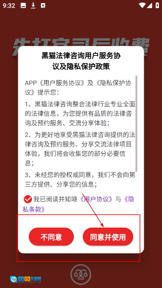 1、在【黑猫法律咨询用户服务协议及隐私保护政策】界面,点击【同意并使用】即可进入软件功能板块。