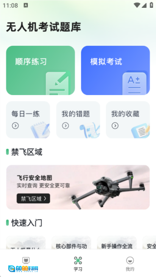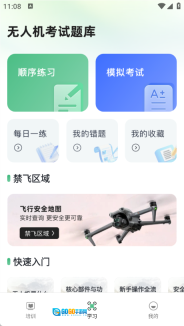2、学习页面设有顺序练习、模拟考试功能,同时包含每日一练、我的错题、我的收藏等版块,还提供禁飞区域与快速入门的相关知识。