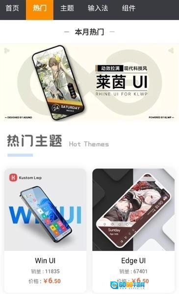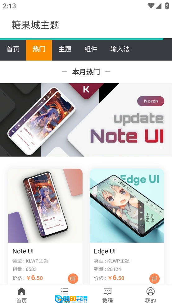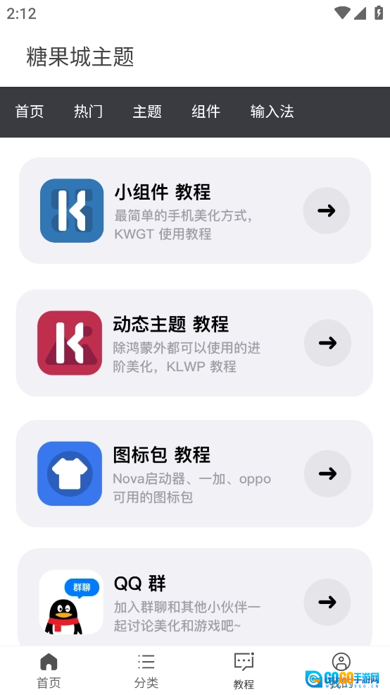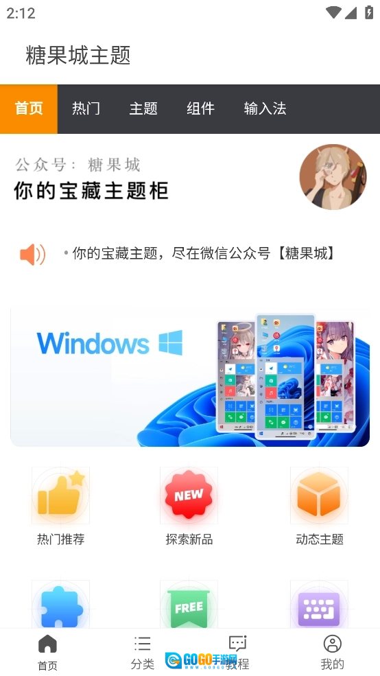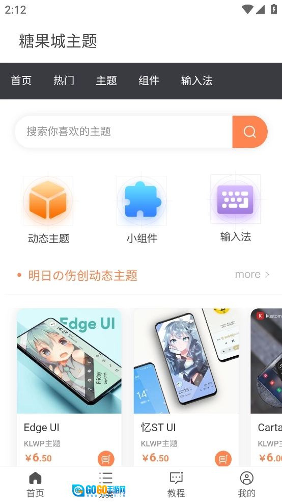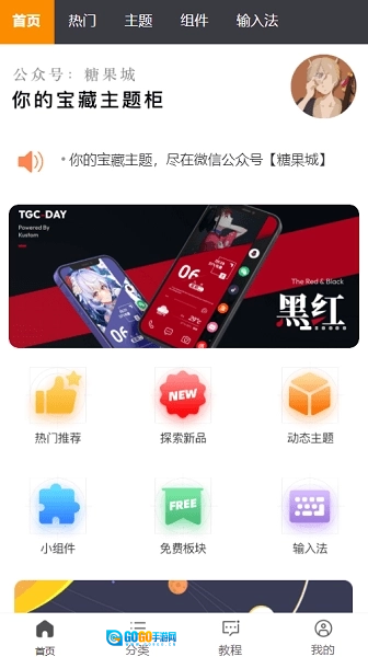 2、可以看软件主界面上方有首页、热门、主题、输入法以及组建等5个选项;而在下方则是以首页、热门、教程以及我的说明为主。