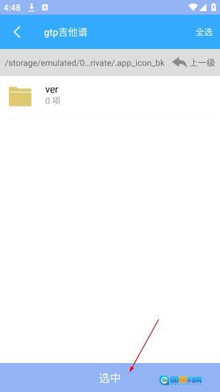 4、找到并选定需导入的吉他谱文件后,点击【选中】按钮,就能把该文件导入GTP吉他谱应用里进行查看或编辑操作。