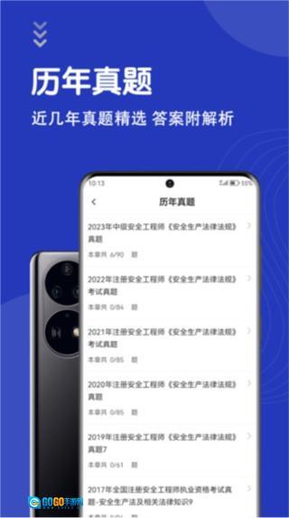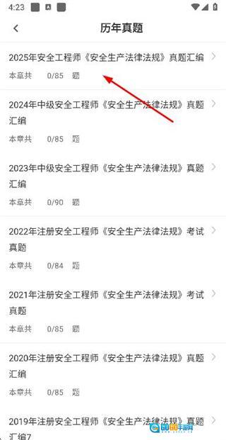 1、在安全生产法律法规页面中找到并点击“历年真题”选项,即可进入历年真题列表页面。
