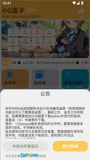 1、小q盒子,安装完成并打开后进入首页,若有公告会自动弹出,此时点击“我已知晓”即可