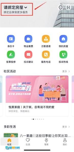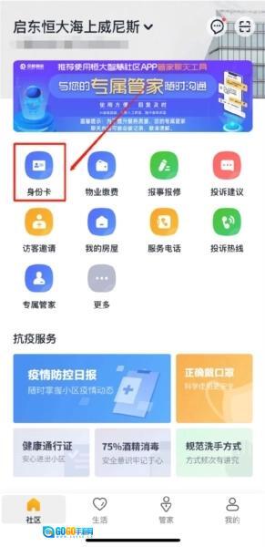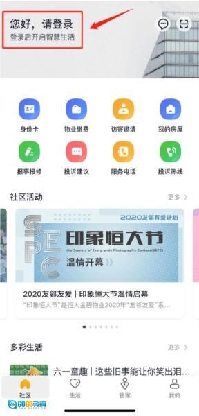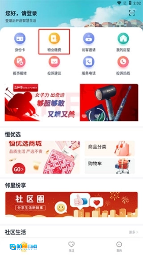 1、最新版的恒大智慧社区,登陆软件后,在首页即可找到“物业缴费”的窗口