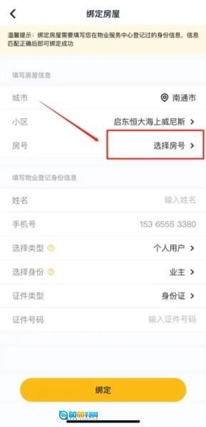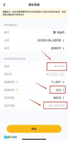 步骤7输入“姓名”-“选择身份”中选择对应的“业主”/“家人”-输入“身份证号”点击绑定按钮。