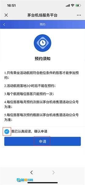 1、点击首页航班售酒预约模块,进入航班售酒预约,请认真查看预约须知,勾选后申请预约;