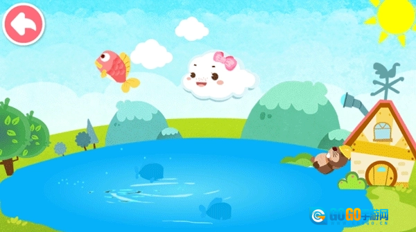2、开始我们可以看见,池塘内的小鱼都因为没有水不能游泳了,我们这时候就需要点击小云朵安吉下雨,为小池塘灌满水吧
