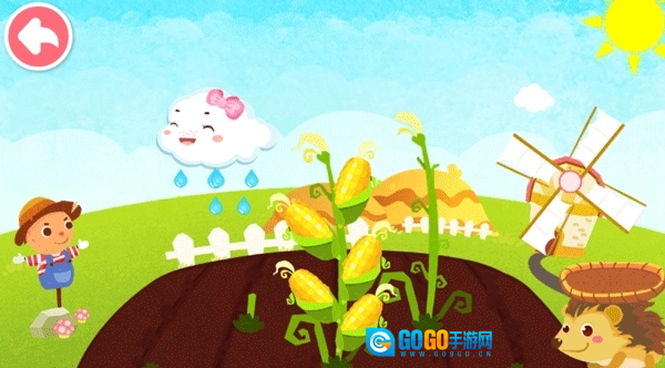 4、我们还能给土地浇水,给农作物补充水分,这样就能收获得很多的食物了,小刺猬非常高兴有丰厚的丰收