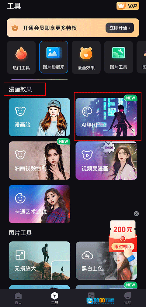 2、在工具模块,找到漫画效果,点击AI绘画;