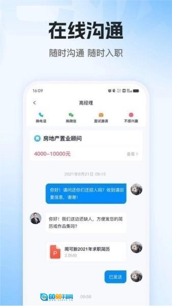 3、高效沟通:随时随地与BOSS开聊,面试邀请线上完成,求职速度大大提升。