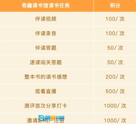 用户可通过完成线上读书任务、上课课程等相关内容,参与活动以及积极分享等即可获得积分,积分可在应用商城中进行兑换书籍、玩具、教具等。下表是各种读书任务在完成后所能获得的积分