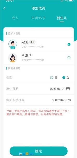 5、【新生儿】添加时需选择监护人、填写新生儿性别、出生日期及监护人联系电话;待新生儿具备本人身份信息后,需携带其有效身份证件至门诊窗口,变更院内档案中的身份证号与姓名,并按照【未满15岁】的流程重新添加信息。
