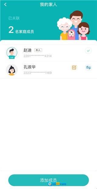 2、【我的家人】-【添加成员】支持添加5个亲情账户,点击【 】切换身份后,可代家人完成挂号、预约、结算、查看报告等操作;