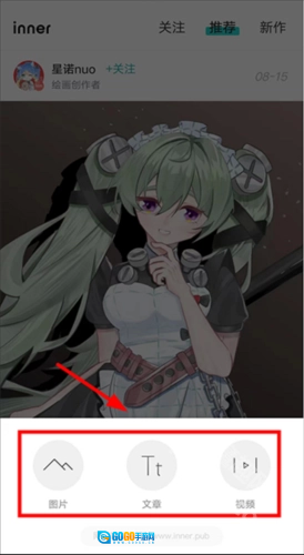 1、打开inner 进入首页,点+号进行发布