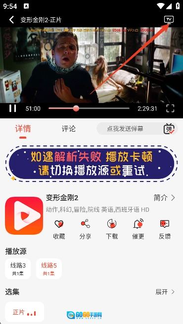 2、在播放页面点击屏幕,点击右上角的TV图标。