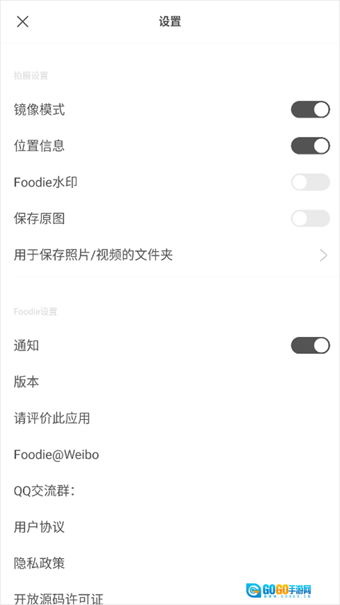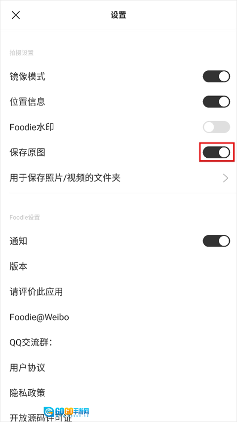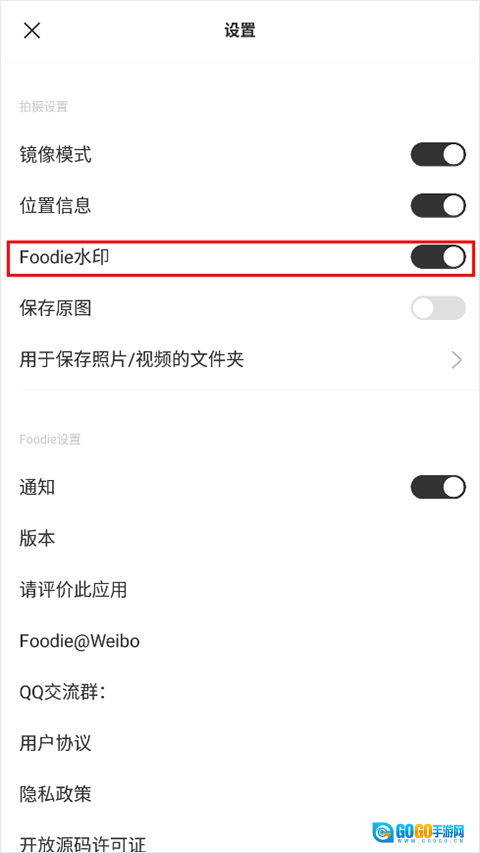 3、进入设置界面后,就能看到foodie水印处于开启状态;