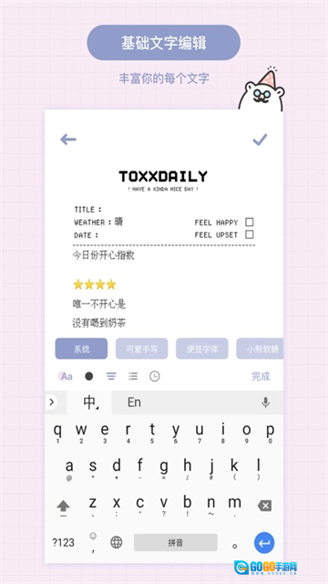 TOXX这款治愈系日记便签本软件,是一款能帮助人们调整心境的笔记类应用。无论是生活里的点滴琐事,还是内心的各种想法与吐槽,都可以通过它记录下来。此外,它还拥有倒计时功能,能让你轻松记住并不错过重要的日子。