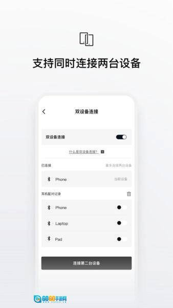 您能够通过应用程序控制单副耳机同时连接两台蓝牙设备,并且可以随时切换来控制不同的耳机设备。