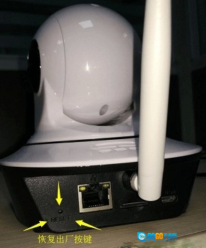 通电后,摄像头会在一段时间内完成自检和旋转动作。待旋转结束,长按摄像头背部网口旁边的“reset”键十秒钟,听到一段短音乐后松开按键。接下来只需等待“叮咚声”响起,就可以进行手机端的操作了。
