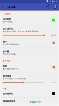 5、发现可以设置液体颜色、透明度、液体的量等液体相关选项,此外还有重力选项,最后则是背景选项。