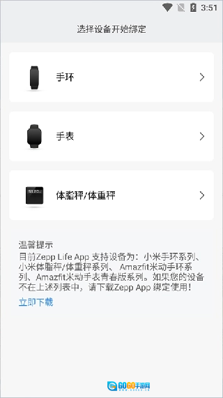 在添加设备页面,点击【手环】选项。